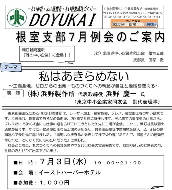 2013年7月3日、弊社代表・浜野が北海道中小企業家同友会・根室支部にて講演をさせていただきました。