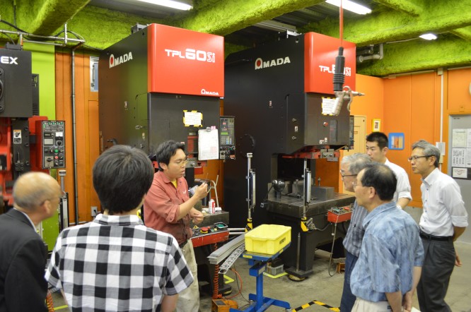 こちらは工場視察の様子です。弊社で工場案内スペシャリストに認定されているプレス加工部門リーダーの角屋より1つの製品が出来上がるまでの加工工程を解説致しました。