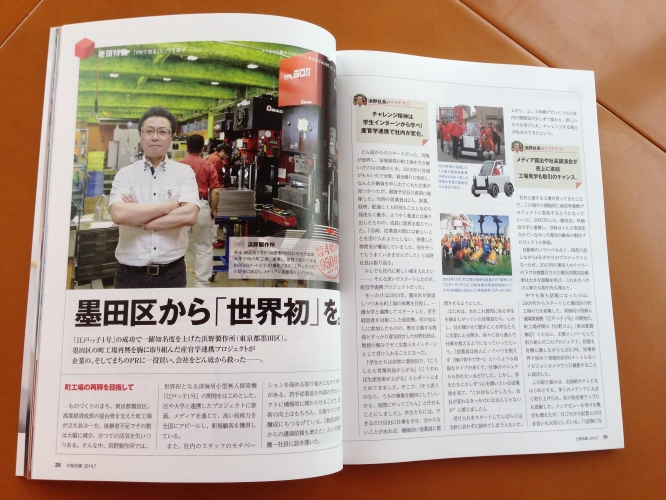 産学官連携事業の電気自動車「HOKUSAI」、深海探査艇「江戸っ子1号」、工場見学の積極的受け入れ、プロジェクト事業を通じた従業員教育の仕組み等が紹介されています。